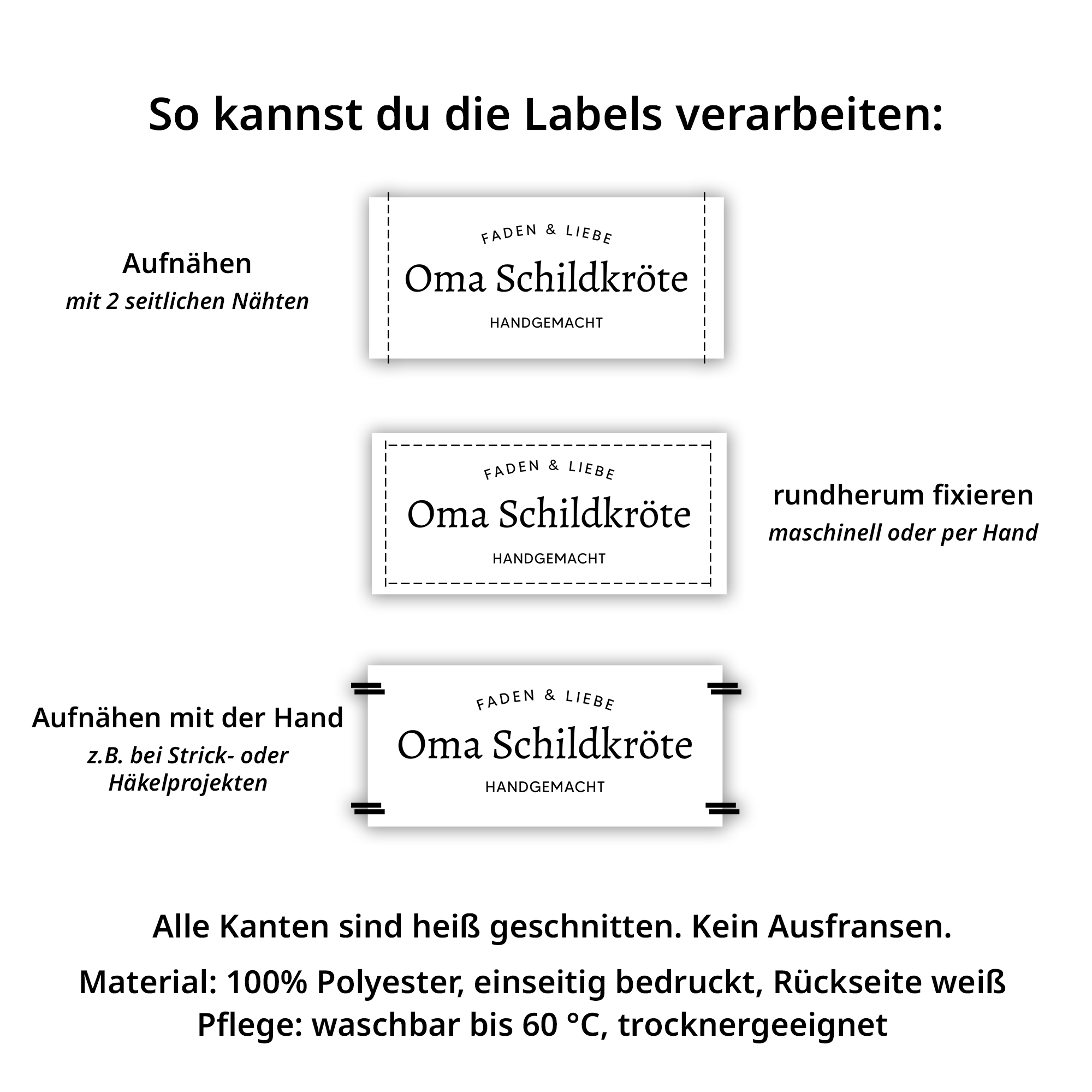 Das Label lässt sich problemlos von Hand aufnähen – auch grob und mit wenigen Stichen. Das macht es zur idealen Lösung für gehäkelte oder gestrickte Waren wie Mützen, Schals, Pullover oder Decken, aber auch für Quilts. Viele Quilterinnen nähen ein persönliches Label auf die Rückseite ihres fertigen Quilts – mit Name, Datum oder einer kurzen Widmung. Da du hier auch einzelne Labels bestellen kannst, ist das kein Problem.